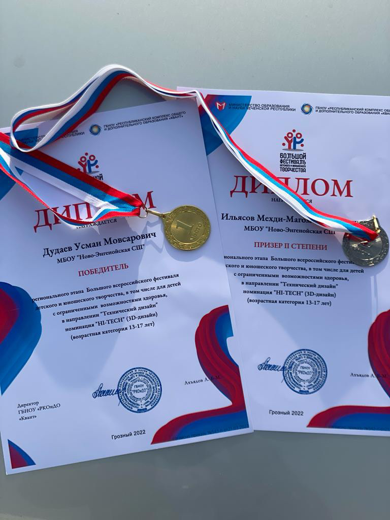 Учащиеся «Ново-Энгенйоской СШ» приняли участие в региональном этапе Большого всероссийского фестиваля детского и юношеского творчества, в том числе для детей с ограниченными возможностями здоровья. Дудаев Усман - ученик … класса стал победителем в направлении "Технический дизайн" номинация "HI-TECH" (3D-дизайн) (возрастная категория 13-17 лет), а ученик….класса-Ильясов Мехди занял второе место, став призером || степени в этой же возрастной категории.