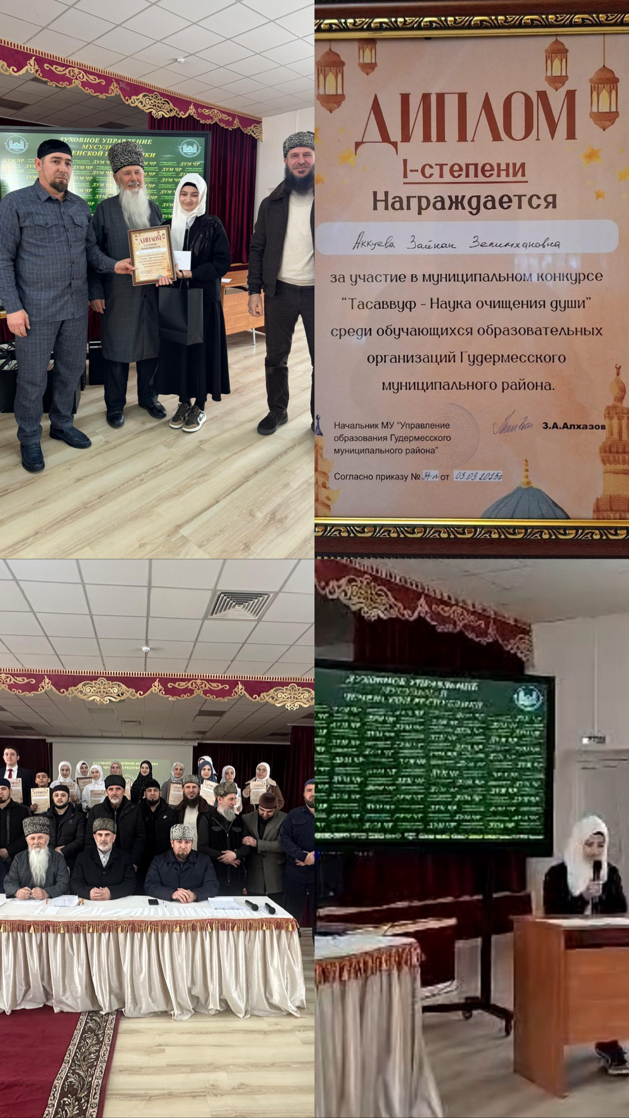 Ученица 8 класса МБОУ «Ново-Энгенойская СШ» Аккуева Зайнап награждена Дипломом 1- степени за участие в муниципальном конкурсе «Тасаввуф - Наука очищения души» среди образовательных организаций Гудермесского муниципального района